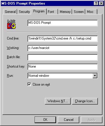 Having a startup script for all your DOS boxes allows you to do common tasks such as setting environment variables and your path. Unfortunately, Windows NT 4.0 DOS boxes are broken in that they ignore the AUTOEXEC.BAT and their "Batch File" property mysteriously has no effect.